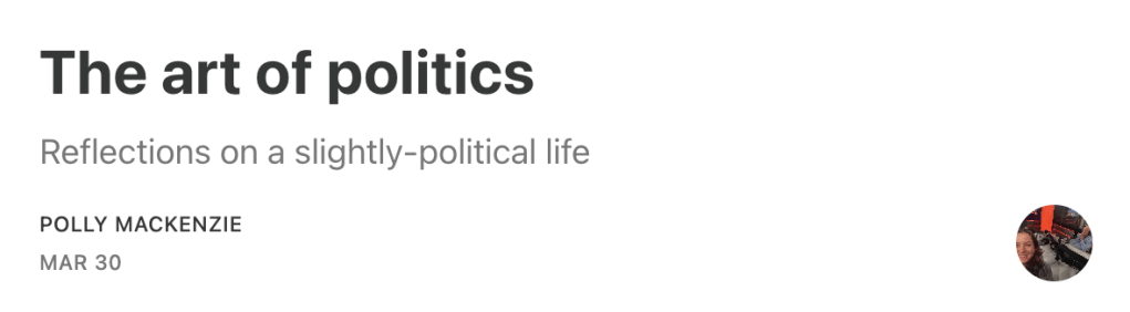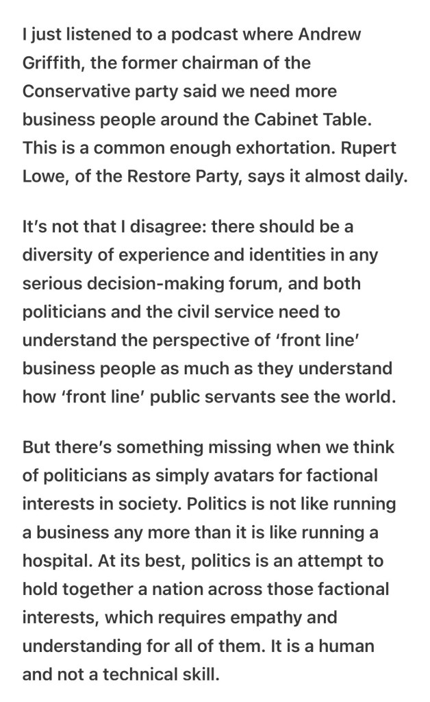 Some wise words today from UK policy wonk Polly MacKenzie. Politics is not like running a business. Some skills are transferable, but more is required. As Ms. MacKenzie says, politicians are not mere avatars for factional interests in society. At best, aim for a diversity of voices around the decision-making table. However, don’t assume success at business translates into success in politics.