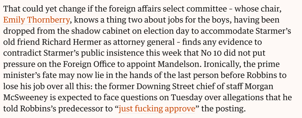 Now that woman, Emily Thornberry, chairs the parliamentary committee that will play an important role in determining whether the current Prime Minister has much of a political future.