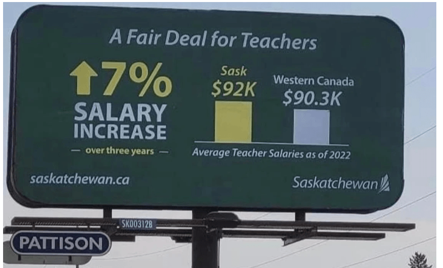The billboards outline the government’s opening salary offer of seven percent, then go on to describe the average salary for a Saskatchewan teacher as $92,000, which the government claims is “more than others in Western Canada”. It is the position of the Saskatchewan Teachers’ Federation that this is a misrepresentation of teachers’ earnings.