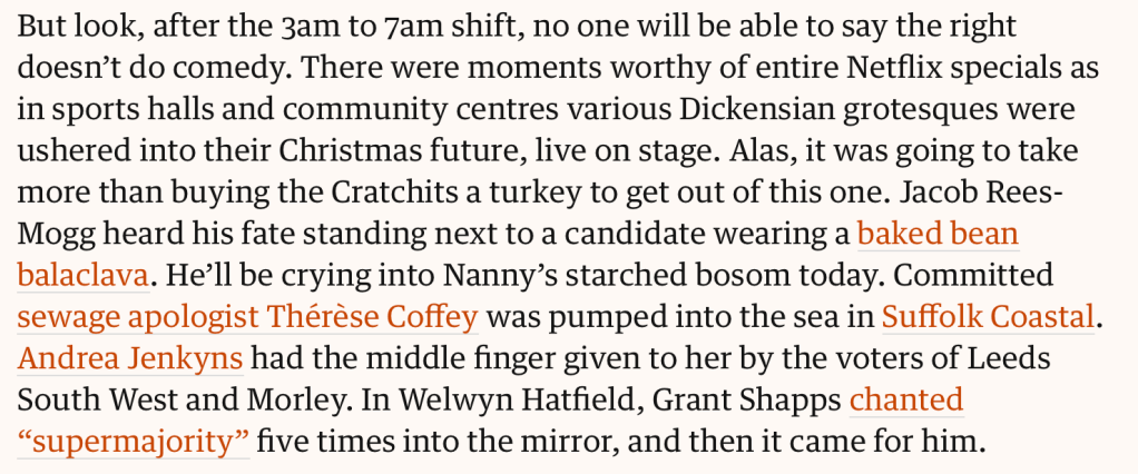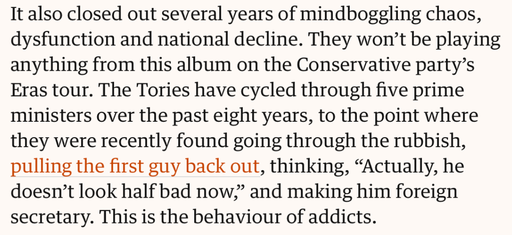 I expect the UK Conservative leadership contest will begin in earnest any time now. Apparently, leading right-wing candidate Suella Braverman had to be talked out of announcing her leadership bit at her constituency results announcement.